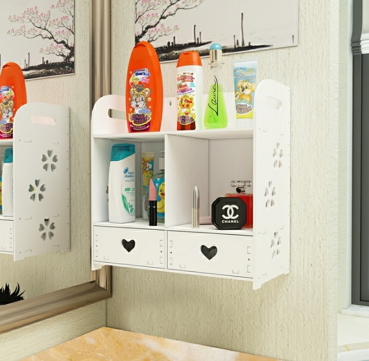 描述 : 免打孔設計,承重好,容量大,防水防潮,可水冼,可放浴室存放小物品,下方有心型抽屜,可放飾物。